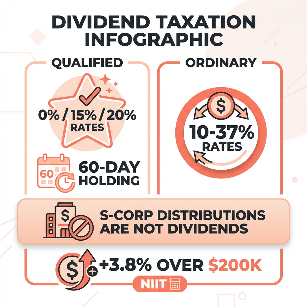 Not all income is taxed equally, and dividends are a clear example. The spread between a 0% qualified rate and a 40.8% ordinary rate on the same dollar amount is enormous. Knowing the rules — holding periods, qualified vs. ordinary treatment, NIIT thresholds, and the S-Corp distribution distinction — puts you in a position to keep more of what you earn.