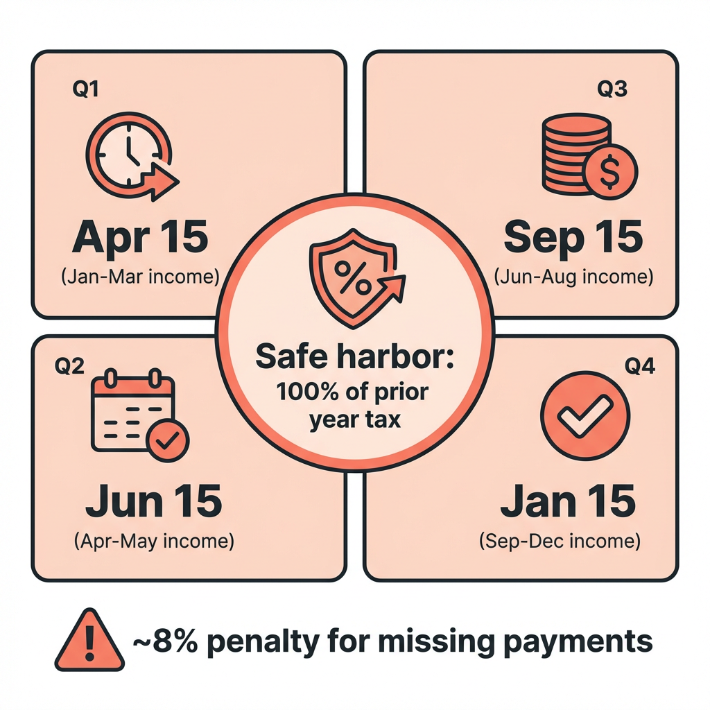 Safe harbor rule: Pay at least 100% of your prior year's total tax liability in four equal installments, and you won't owe a penalty — even if you owe more at filing time. (110% if your prior year AGI exceeded $150,000.)
