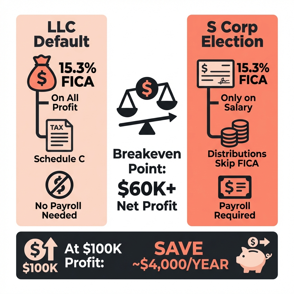 The tax savings mechanism: As a default LLC, you pay 15.3% self-employment tax on every dollar of net profit. With an S Corp election, you pay yourself a "reasonable salary" (subject to payroll taxes) and take remaining profit as distributions — which skip the 15.3% self-employment tax entirely.