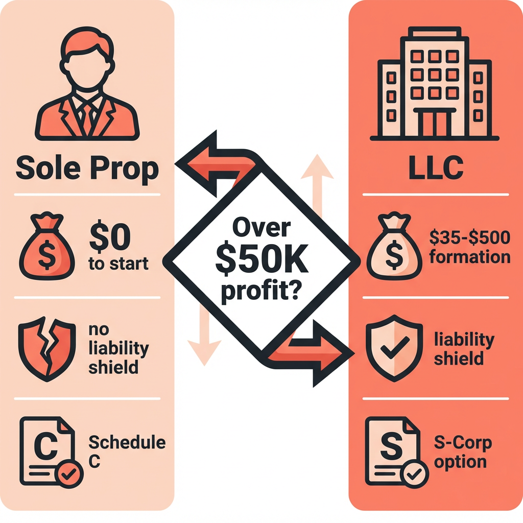 The quick decision: If your net profit stays under $30,000 and your business carries low liability risk, a sole proprietorship works fine. Once you cross $50,000+ in profit or face meaningful liability exposure, an LLC starts paying for itself.